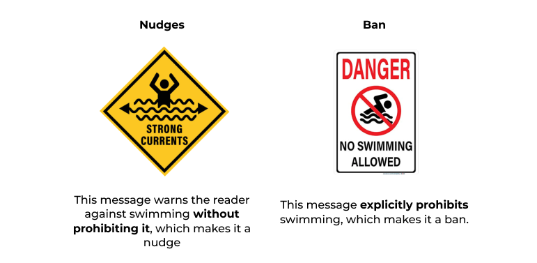 Nudges became prominent in UX/UI design thanks to the Harvard and University of Chicago professors Cass Sunstein and Richard Thaler. The two define nudging as gently steering users toward particular actions while maintaining their freedom of choice. See the following example of a real-world nudge: