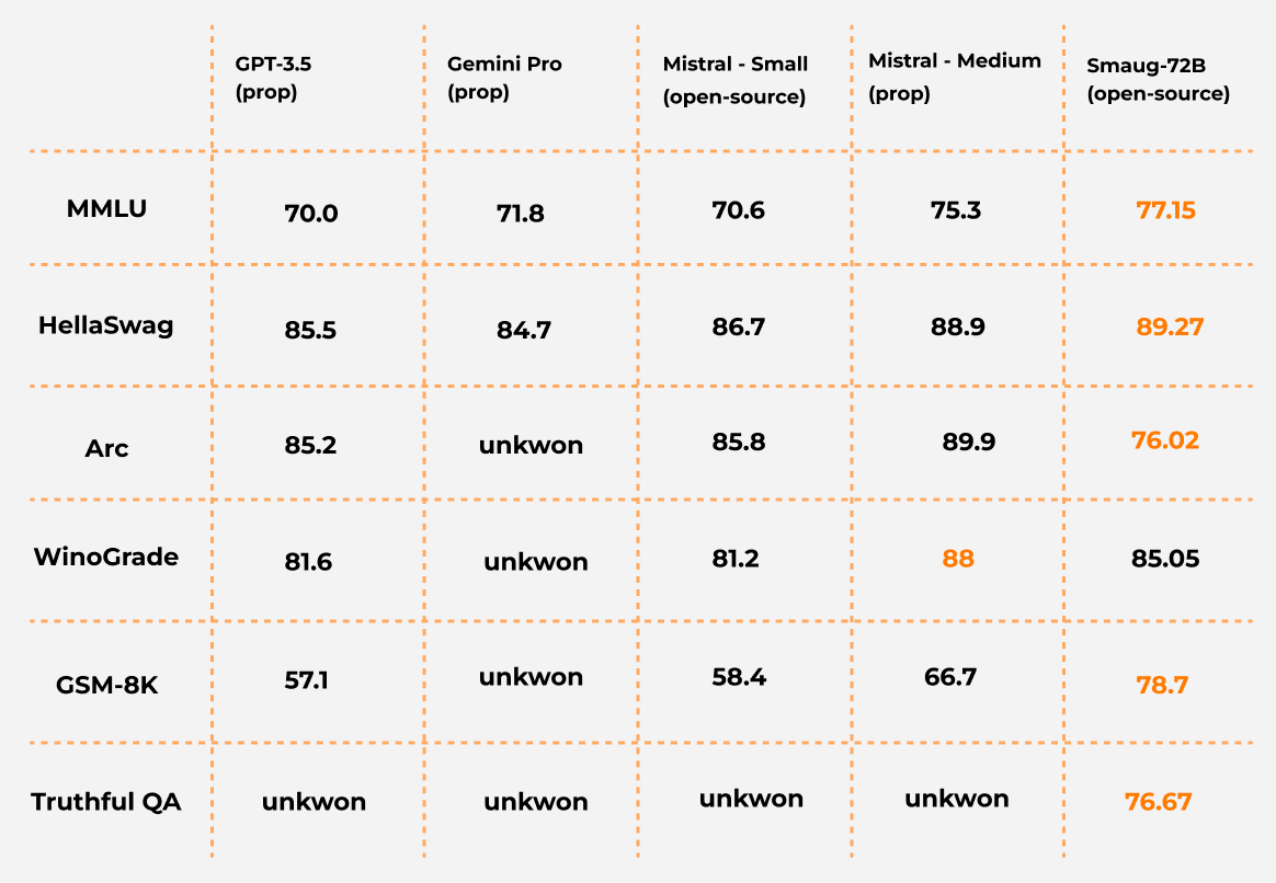 I won’t dare dive into the difference between licensing models, but let’s use “open-source” as a catch-all for when you take the code, modify it, and even call it yours. This includes hundreds of LLM models, with prominent examples like Smaug-72B, Qwen-72B, Mixtral 8x7B, and more.